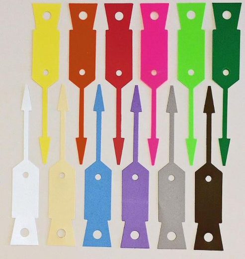 Slip Lock Key Tags that are practical and easy to use for customer keys control. Secure self-locking arrow-shaped key tags. Easy to write on for identification. Hole in the tag to hang on a hook. Made of durable plastic. Packaged in bundles of 1,000. Choose from 7 different premium colors: Black, Hot Pink, Lime Green, Purple, Gray, Fluorescent Orange, and Gold. All colors can be color-matched with Magnetic Roof Toppers and Plastic Mirror Hangers. Also available in 8 other colors: White, Yellow, Light Blue, Royal Blue, Green, Orange, Red, and Tan.
