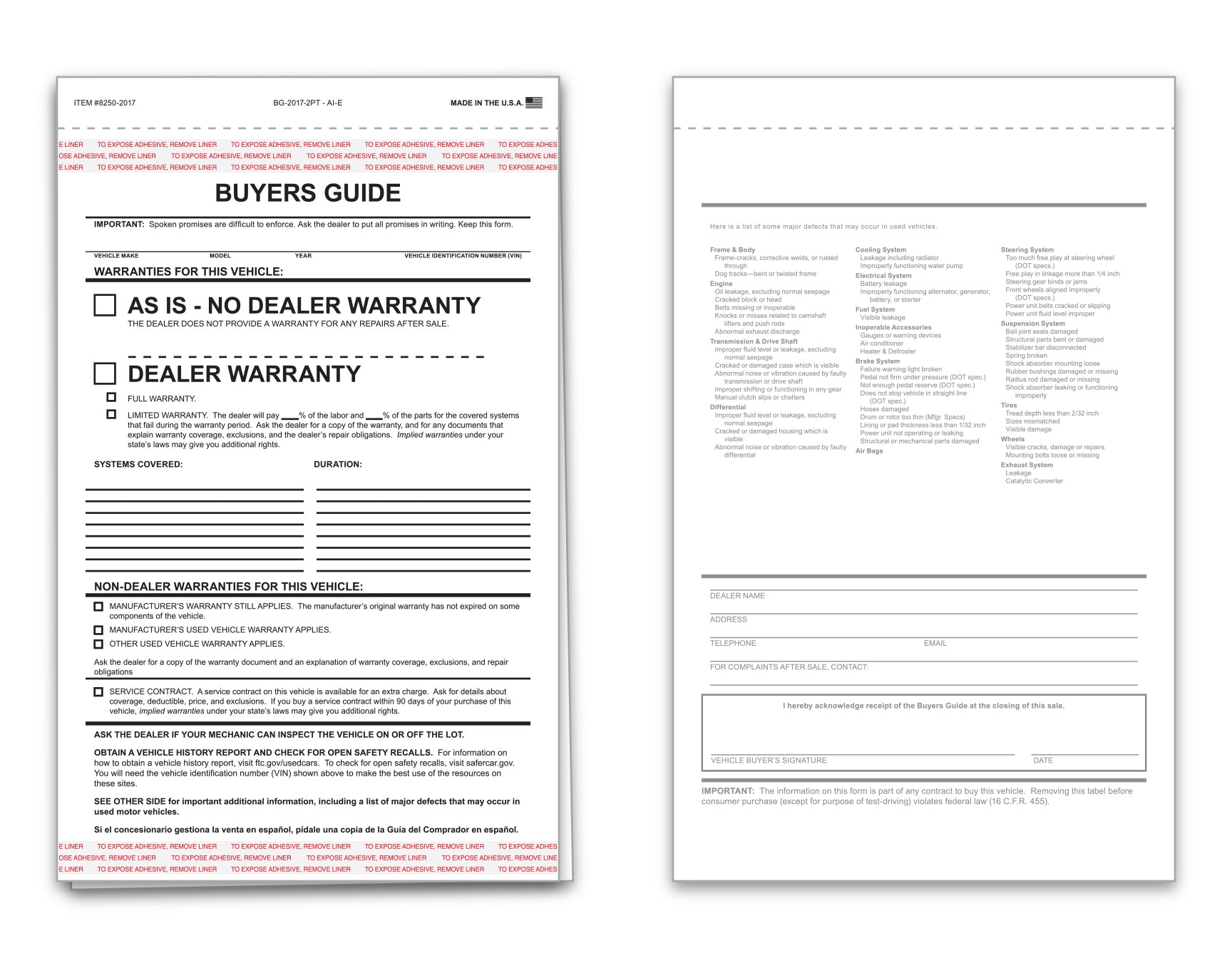 2-Part NCR Buyers Guide – 7-1/3” x 11-3/4”. White/white with adhesive strips on top and bottom of top sheet. Conforms to the new Federal Law. Affixes to inside of vehicle window. Also available in “Implied Warranty” version, and 1-Part Pressure Sensitive.