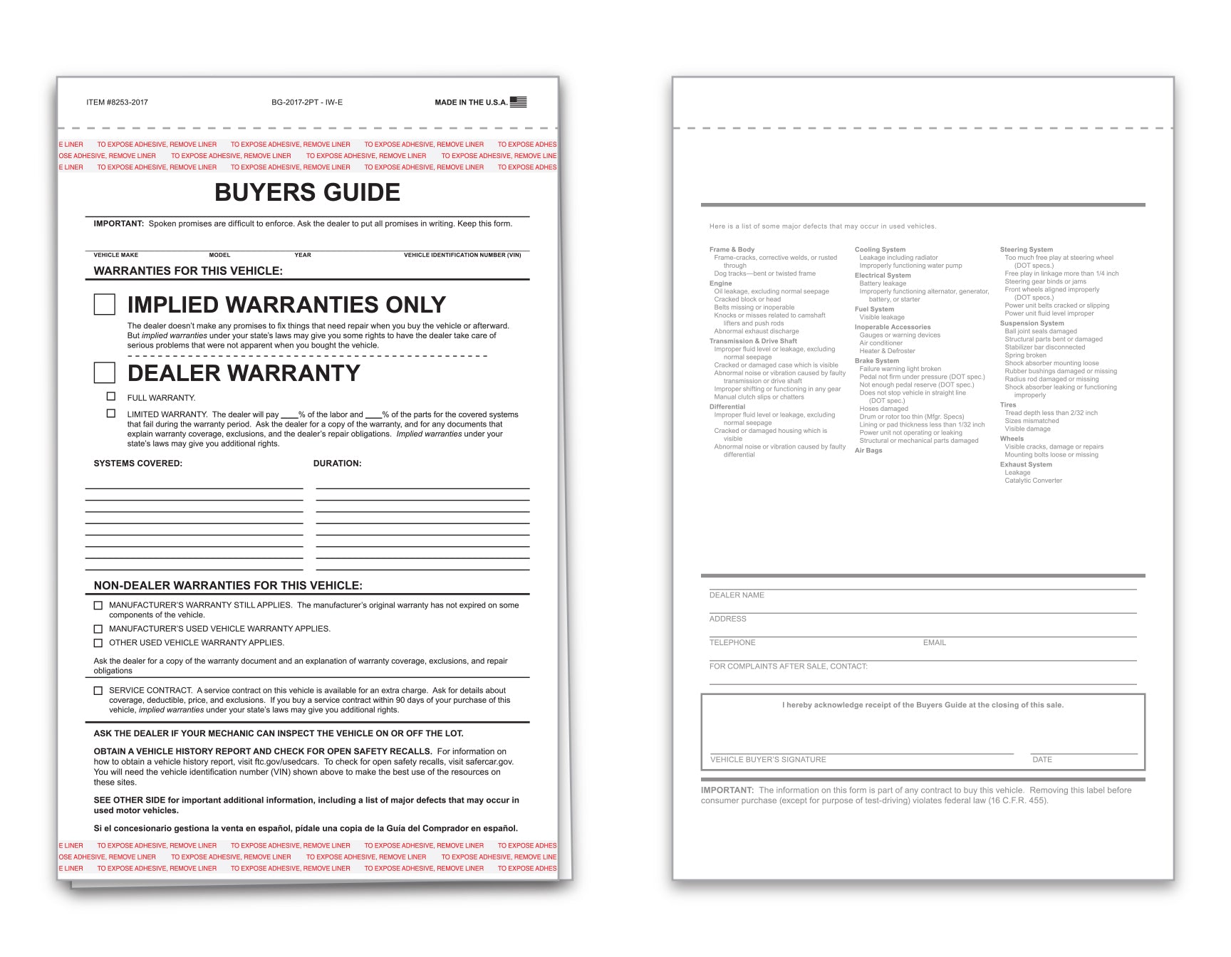2-Part NCR Buyers Guide – 7-1/3” x 11-3/4”. White/white with adhesive strips on top and bottom of top sheet. Conforms to the new Federal Law. Affixes to inside of vehicle window. Also available in “As Is” version, and 1-Part Pressure Sensitive.