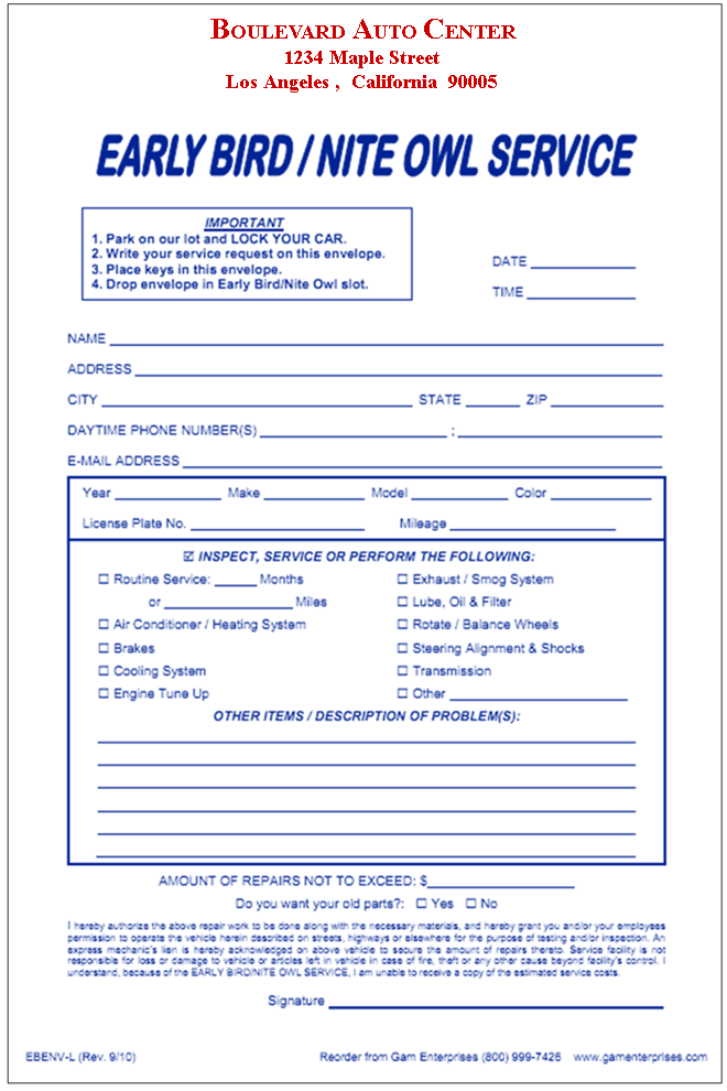 Let your customers drop their car off before you open! They can leave their keys and any messages insecure (6" x 9" catalog) envelopes personalized for your company. 500 per box, 10 box minimum order (5,000). Fits most Early Bird Boxes. Regular Early Bird Envelopes (#10 policy) also available.