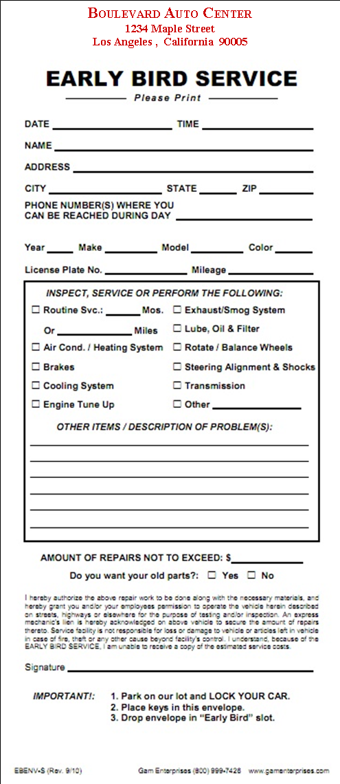 Let your customers drop their car off before you open! They can leave their keys and any messages insecure #10 policy Early Bird Envelopes (4-1/8" x 9-1/2") personalized for your company. This size fits our exclusive Early Bird Box, as well as all others. 500 per box, 10 box minimum order (5,000). Standard print available. Large Early Bird Envelopes (6" x 9" catalog) also available.
