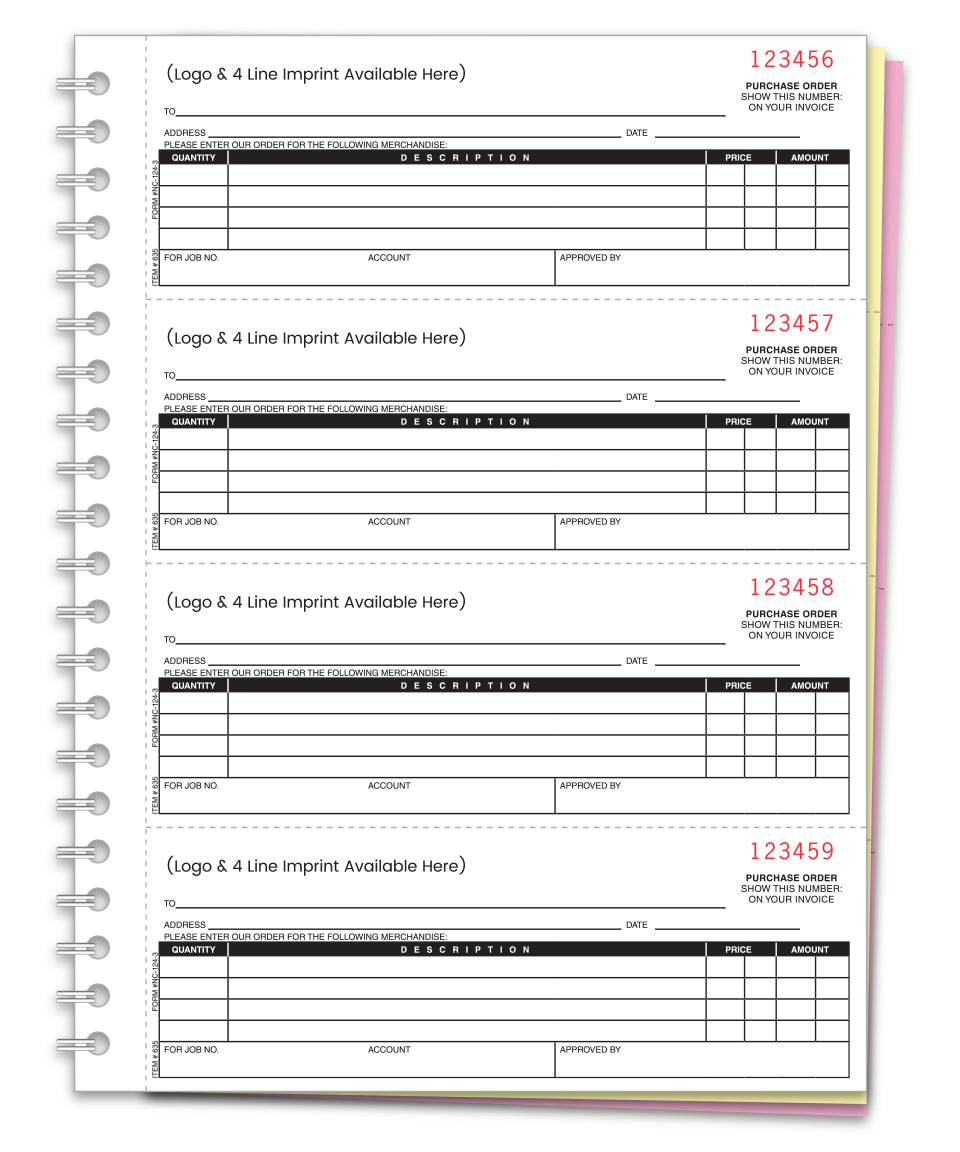 Coil bound book with heavy stock cover. 3-Part NCR; control copy remains in the book. 8-1/2” x 11” pages; 4 P.O.’s per page, 7-1/2” x 2-3/4” each. 200 sets per book. Up to 4 lines imprinted in red, blue, black, or green. Choice of starting number. Plain books also available.