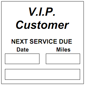 Make all your customers feel like V.I.P.’s! Stickers are preprinted with "V.I.P. Customer", plus white writing blocks. Write in the date and/or miles for their next service to be sure they return on time! 500 per roll. Custom Service Reminder Static Cling Stickers also available.