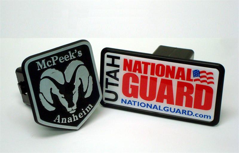More effective advertising! The Trailer Hitch Cover plugs into any standard 2" trailer receiver. Includes a removable fastener. The face plate features your choice of custom raised letters, logo design, shape (up to 4" x 6"), and premium color combination. Molded from durable plastic. 125 minimum order. Domed Urethane also available.