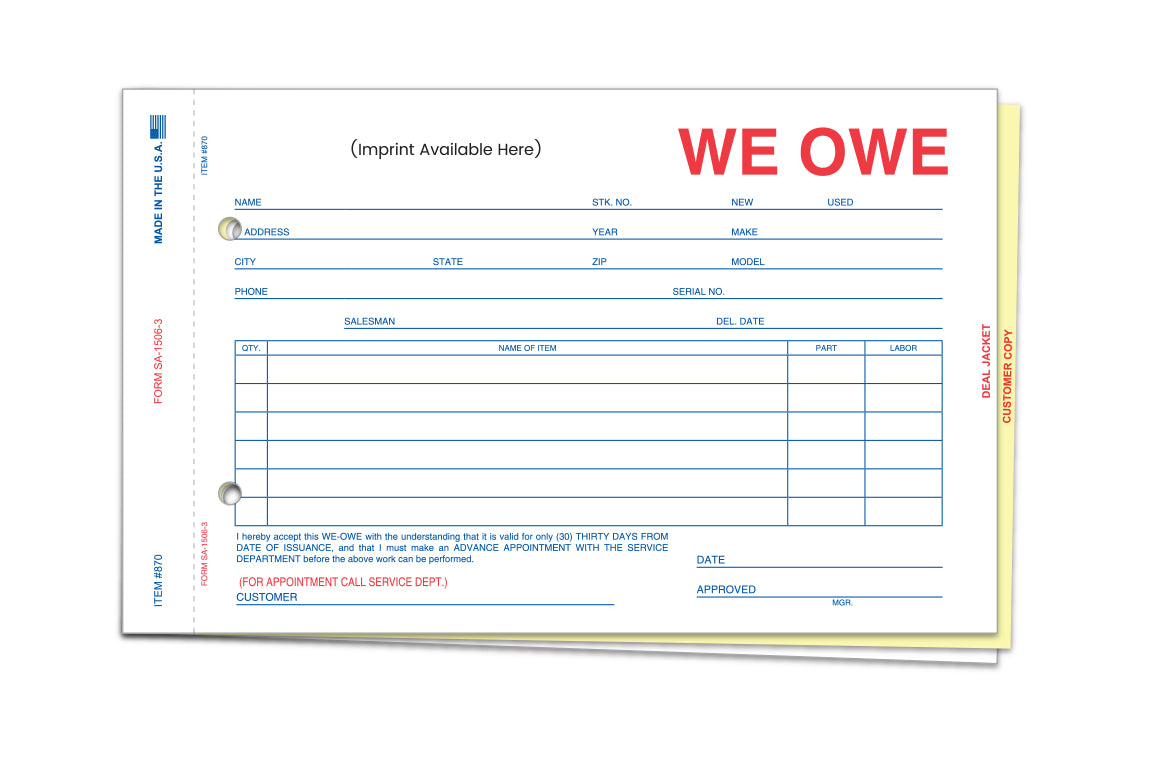 We Owe Form. 3-Part NCR; 9-1/4” x 5-1/2”. 100 per package. Up to 4 lines imprinted in red, blue, black, or green. Plain forms also available.