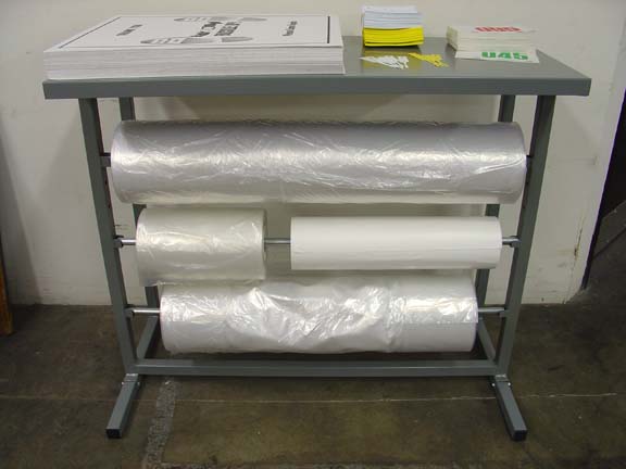 Our unique combo storage rack storage system holds multiple rolls of seat covers, tire bags, plastic floor mats and parts bags. The extra large shelf can hold all of your other car protection and identification items, such as floor mats, steering wheel covers, key tags, etc. Made of heavy gauge steel and powder coated for extra protection.
