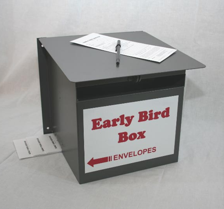 Multi-use early bird lock box for off-hour car drop off. Early Bird Envelopes are dispensed from a built in envelope storage compartment. The locking lid also serves as a counter for customer use. Customers keys and documents are secure in the locked compartment until you open. Made of thick sheet metal and powder coated with a smooth rust proof industrial finish. Mount on any wall. Standard or personalized Early Bird Envelopes available.