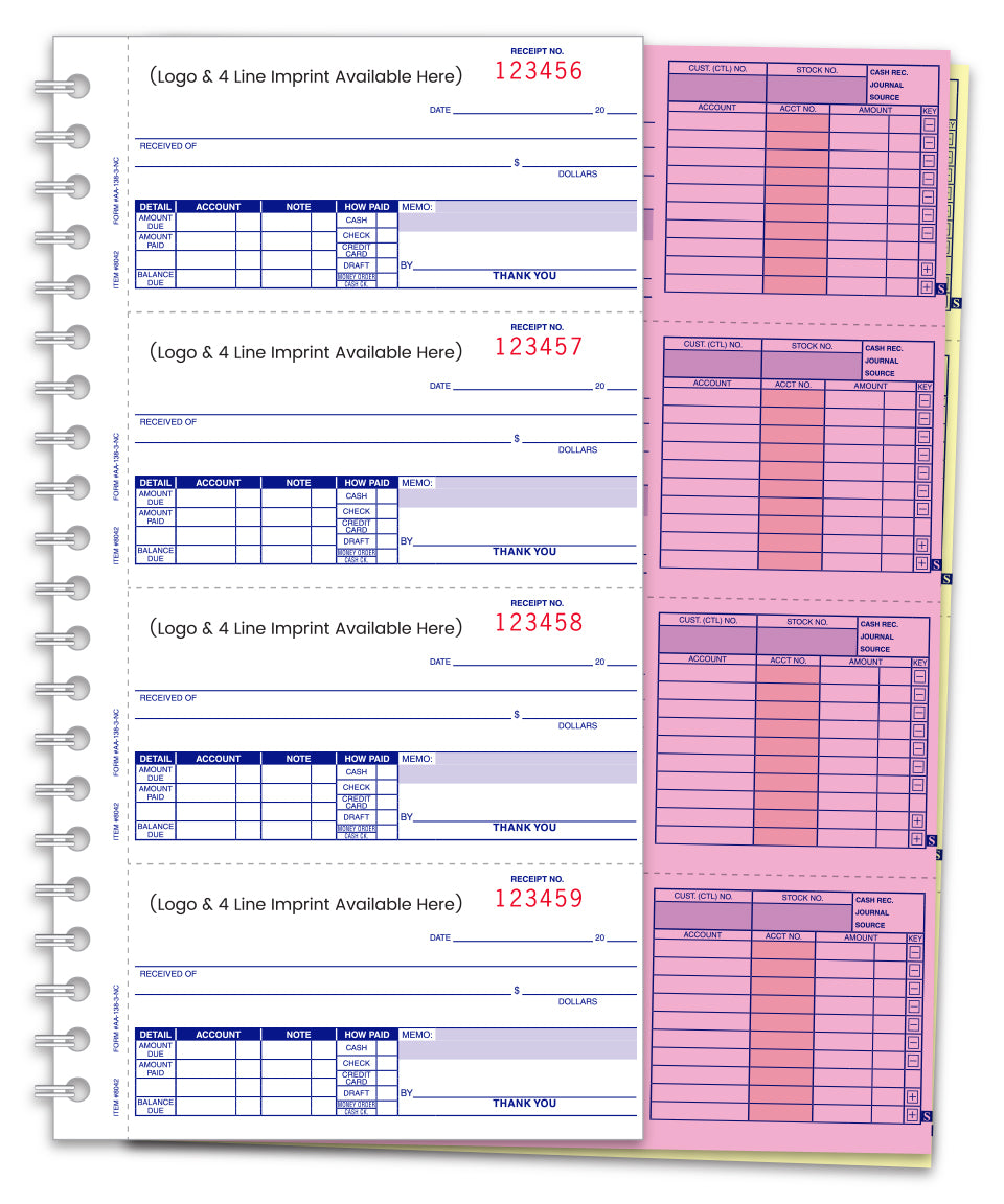 Coil bound cash receipt book with heavy stock cover. 3-Part NCR (1 short, 2 long). 8-1/2” x 11” pages; 4 receipts per page, 8” x 2-3/4” each. 200 sets per book. Up to 4 lines imprinted in red, blue, black or green. Choice of starting number. Plain books also available.