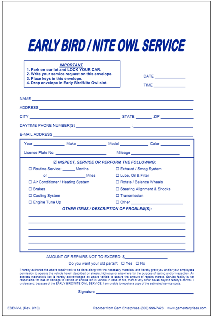 Let your customers drop their car off before you open! They can leave their keys and any messages in secure large Early Bird Envelopes (6" x 9" catalog). 100/box. Fits most Early Bird Boxes. Personalized available. Regular Early Bird Envelopes (#10 policy) also available.